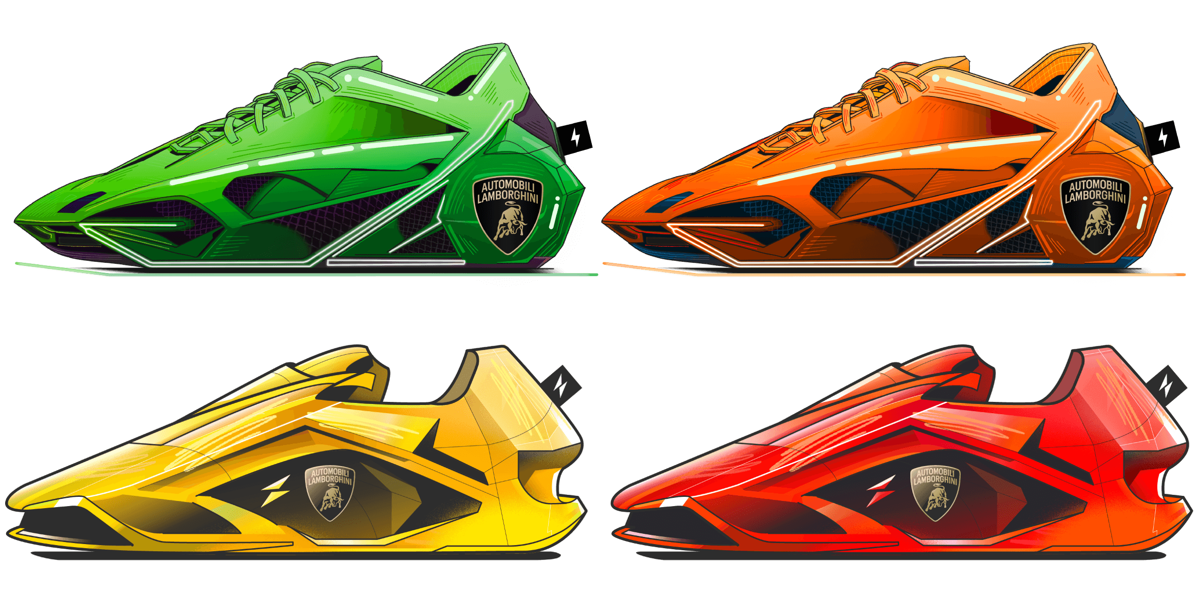 Every Sneaker in the STEPN and STEPN GO x Lamborghini collection is inspired by real Lamborghini models and colors, from bold greens and oranges to racing reds and intense yellows. The goal wasn’t just to “add a logo”, but to translate the look and feel of a Lamborghini into sneaker form: